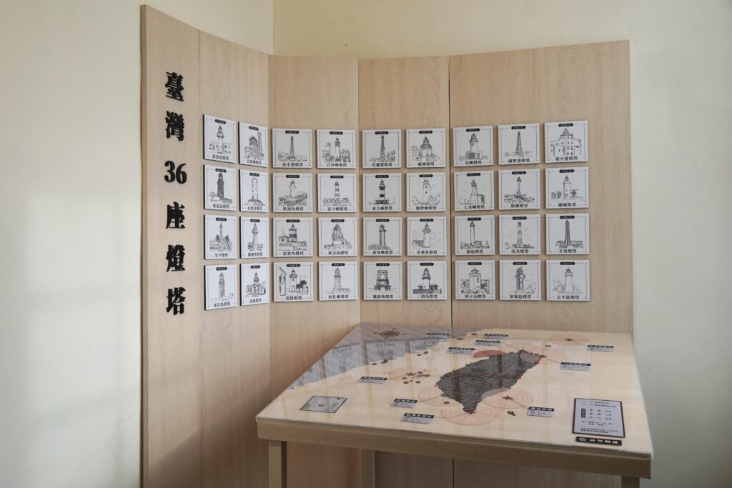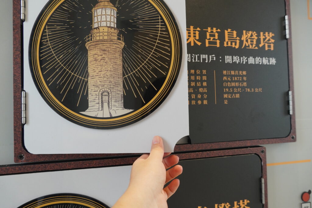 走入小而美的展覽空間,一幅大型互動地圖標示了臺灣各地的燈塔位置。策展團隊將代表燈塔的故事轉化為翻卡裝置,邀請觀者親自探索其建造背景、選址依據與形制特色。在這裡,你可以讀到漁翁島燈塔如何以花生油點亮第一盞沿海燈火、富貴角燈塔為何漆上黑白兩色,清治時期政府又如何引入英國的現代化工業技術;除了動人的歷史故事之外,展覽更透過插畫圖解,說明「燈高」與「塔高」的差異、燈塔結構等實用層面的知識。