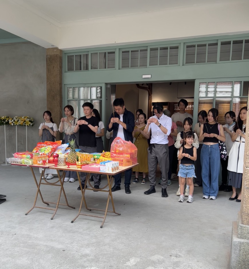 小本團隊副總經理黃建森帶領眾人,在長源醫院民族路側的騎樓下敬拜天地眾神,祈求「長源醫院-鹿港歷史影像館」未來營運順利。
