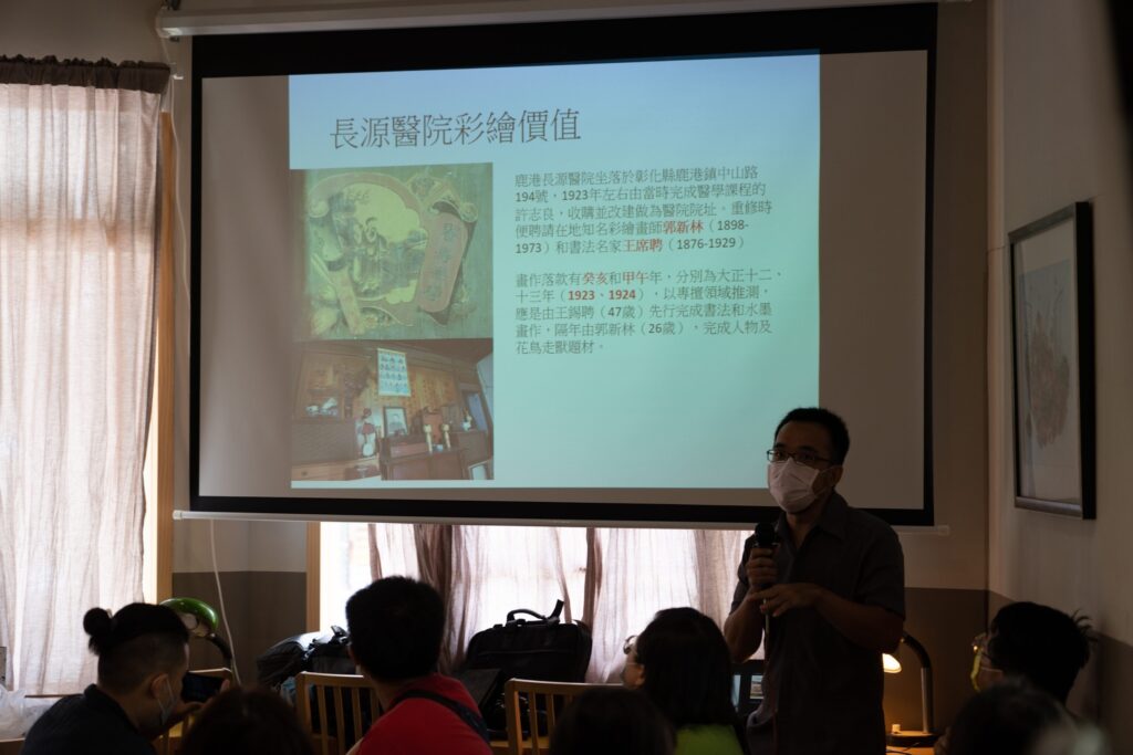 為了讓一般大眾也能了解到彩繪壁畫修護的相關知識,雄本團隊在 7/16 (六)與台灣古蹟修復師李志上老師,以及負責為長源壁畫進行修復的名襄文化彩繪修護合作,舉辦了一場結合長源醫院現地導覽,以及彩繪修護實作的工作坊。當天參與的 26 位學員,在長源醫院集合聆聽導覽,首先由雄本老屋的共同創辦人蕭定雄,以及長源醫院的屋主許正園醫師,向學員們說明長源醫院的故事以及目前的營運和保存模式。最後經過李志上老師的導覽,大家除了對於壁畫的彩繪修護有初步的認識,也藉此參觀了長源醫院的第一進一樓空間,建立壁畫修護與老建築保存之間的關聯圖像。