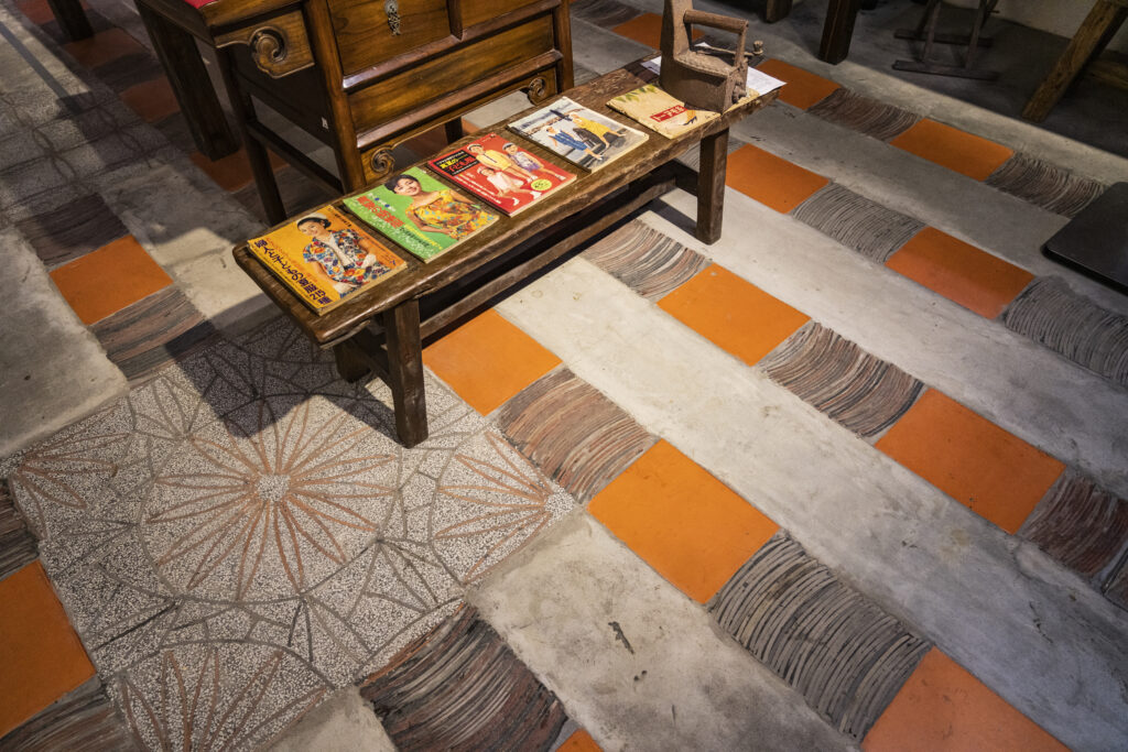 圖一/源古本舖以桌椅陳放舊時雜誌,自然展現出常民生活的美感與趣味性,而嵌入地坪的舊瓦在美觀之餘,也改善了室內的排水透氣機能。(影像來源/許震唐拍攝)