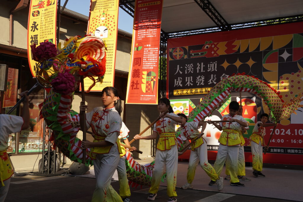 壓軸演出為永福國小龍隊,孩子們在密集的鼓聲中舞動神龍,運用滾水、帶頭、帶中、帶尾、捆龍等技法,演繹神龍騰雲駕霧時修長矯健的身姿。龍隊精準的動作、協調的默契,源自校方對於傳統技藝傳承的重視:除了邀請大溪共義團神龍組為孩子們進行長期的學習訓練之外,永安國小龍隊也時常參與周邊鄰里、廟宇的慶典活動,將社頭文化帶進街區。