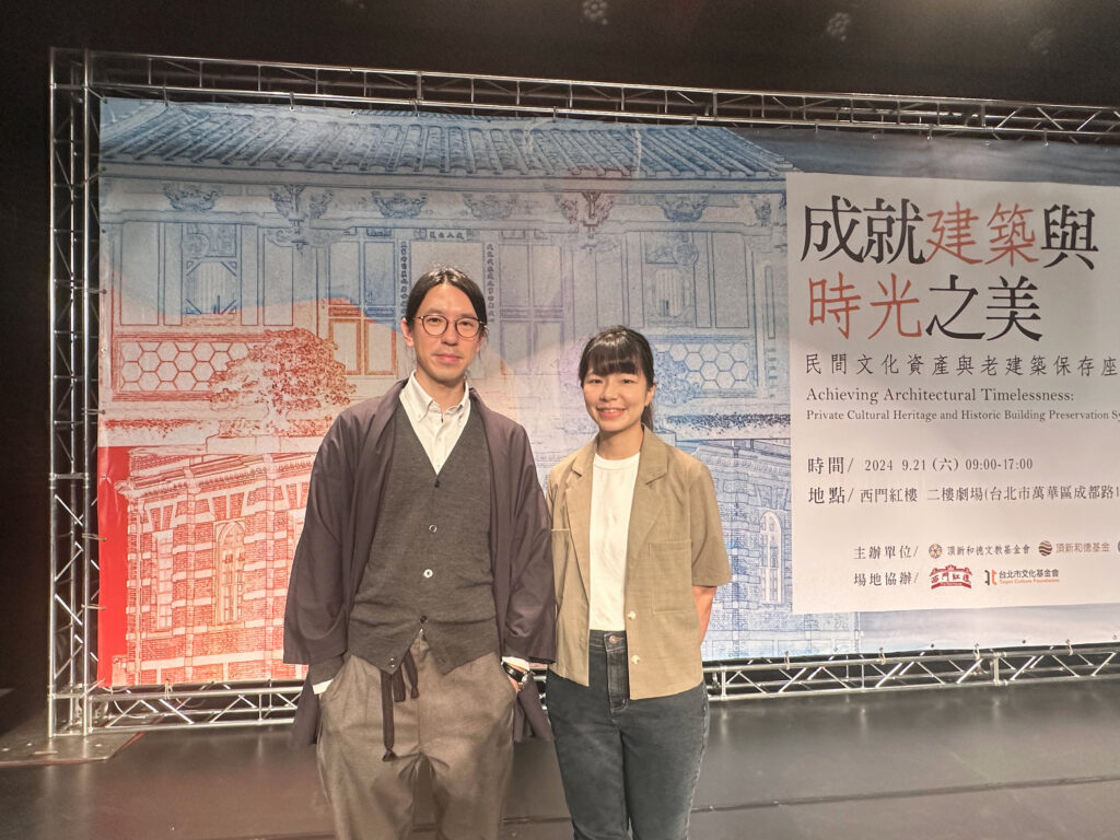 雄本老屋共同創辦人暨資深經理蕭定雄(左一)與文資平台部專員潘宜珣(左二)受邀參與「成就建築與時光之美」座談會。