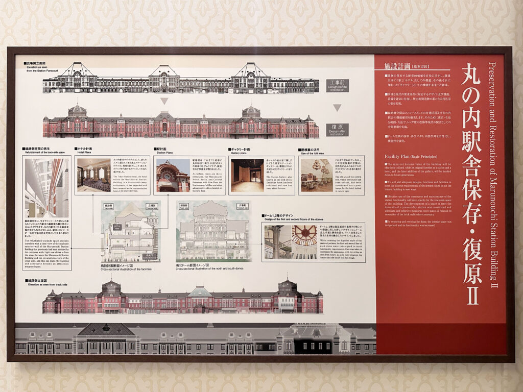 直到 20 世紀末,丸之內地區的開發計畫使得這座老車站的存廢問題浮上檯面,經營團隊甚至曾規劃將站舍徹底拆除、改建為高樓——此項提案引發地方居民與文資保存團隊的反彈,促使政府及相關單位重新審視站舍的文史價值,決心將東京車站復原至落成時期的宏偉樣貌。2003 年,東京車站被指定為日本「重要文化財」,其修復工程在 2007 年啟動,在保存、加強現存磚造結構之外,更以強化混凝土重建三樓空間,恢復了優雅的圓頂造型與泥塑雕花。
