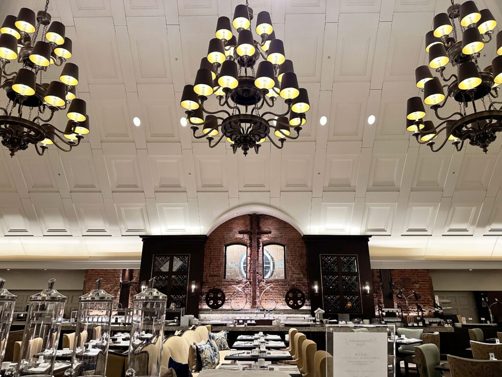 東京車站大飯店在許多角落刻意呈現建築紅磚結構。圖為站舍四樓「The Atrium」餐廳內部。