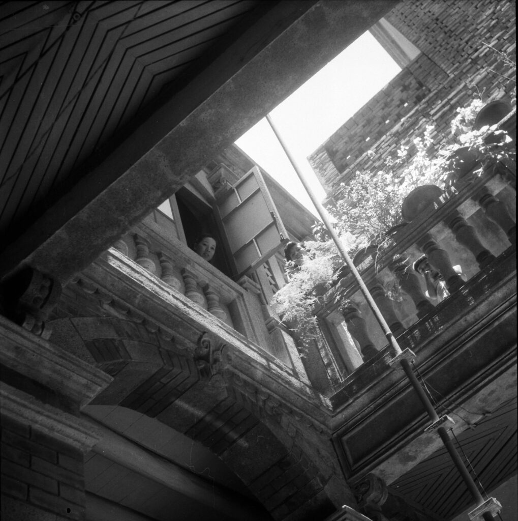 ▲許家過去的家庭生活影像,是修復長源醫院時重要的參考資料。圖為一、二進之間天井的今昔對比,可以見到欄杆處已經過整修,歷史照片中也呈現出此空間曾用於運輸物品的機能。(歷史影像來源/許正園醫師)