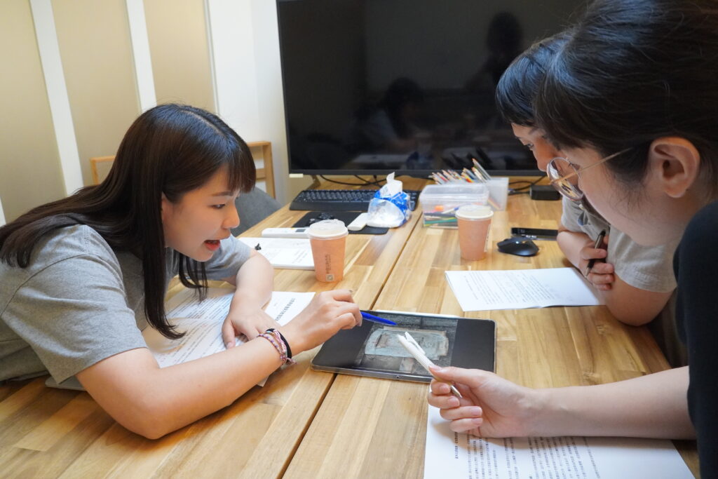 ▲潘宜珣(左一)正與雄本團隊說明精巧瓦的細節特色。