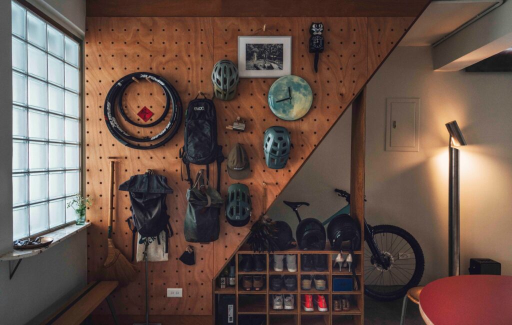 圖一/臺北單車 Space Station 玄關處的洞洞牆背板設計,允許使用者彈性運用空間,收納單車備品。