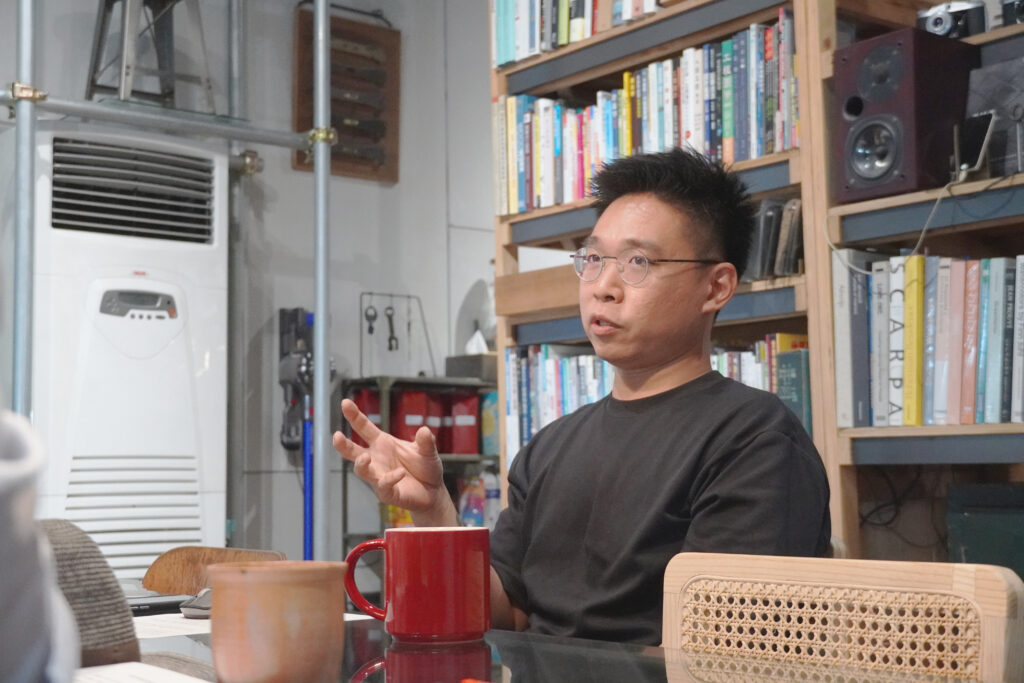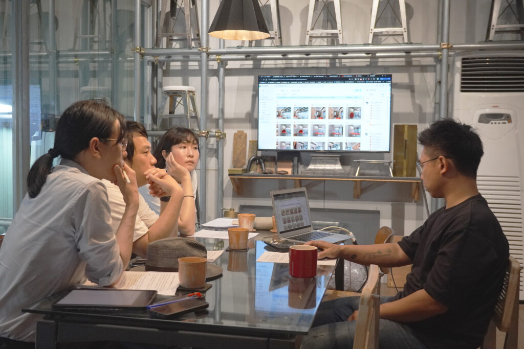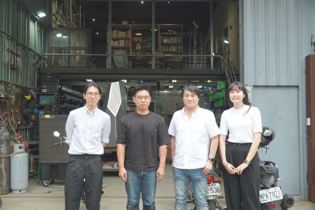 壹式設計創辦人 Rick(右一)與雄本老屋團隊說明「臺北單車 Space Station」中的傢俱設計理念。