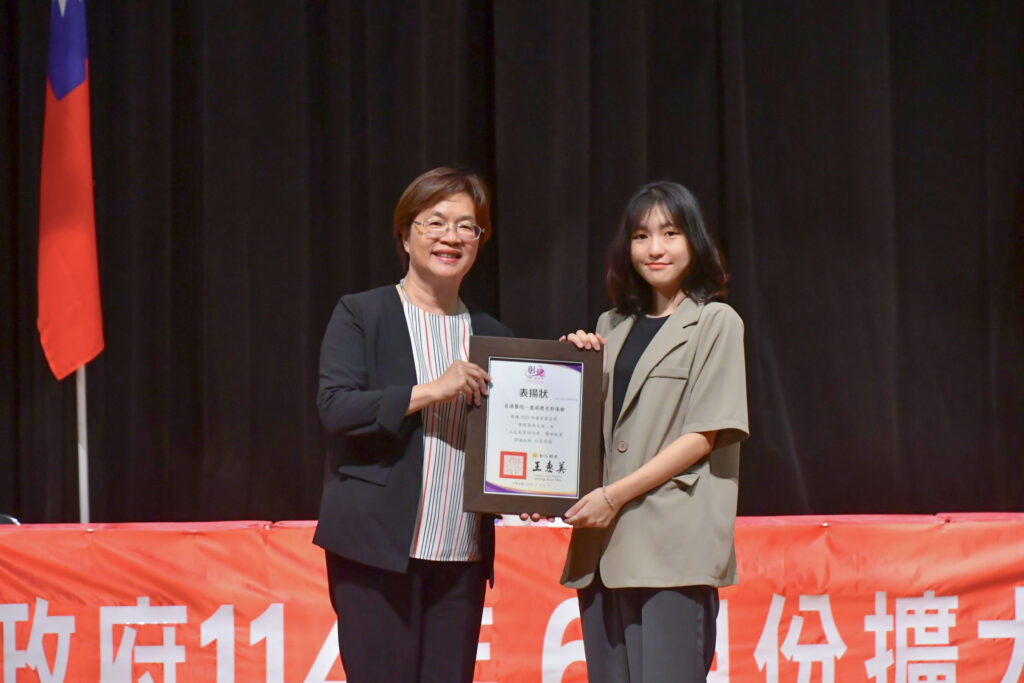 彰化縣長王惠美(左一)頒發表揚狀予「長源醫院-鹿港歷史影像館」,由雄本老屋跨領域規劃部-蔡郁萱主任(左二)代表受獎。